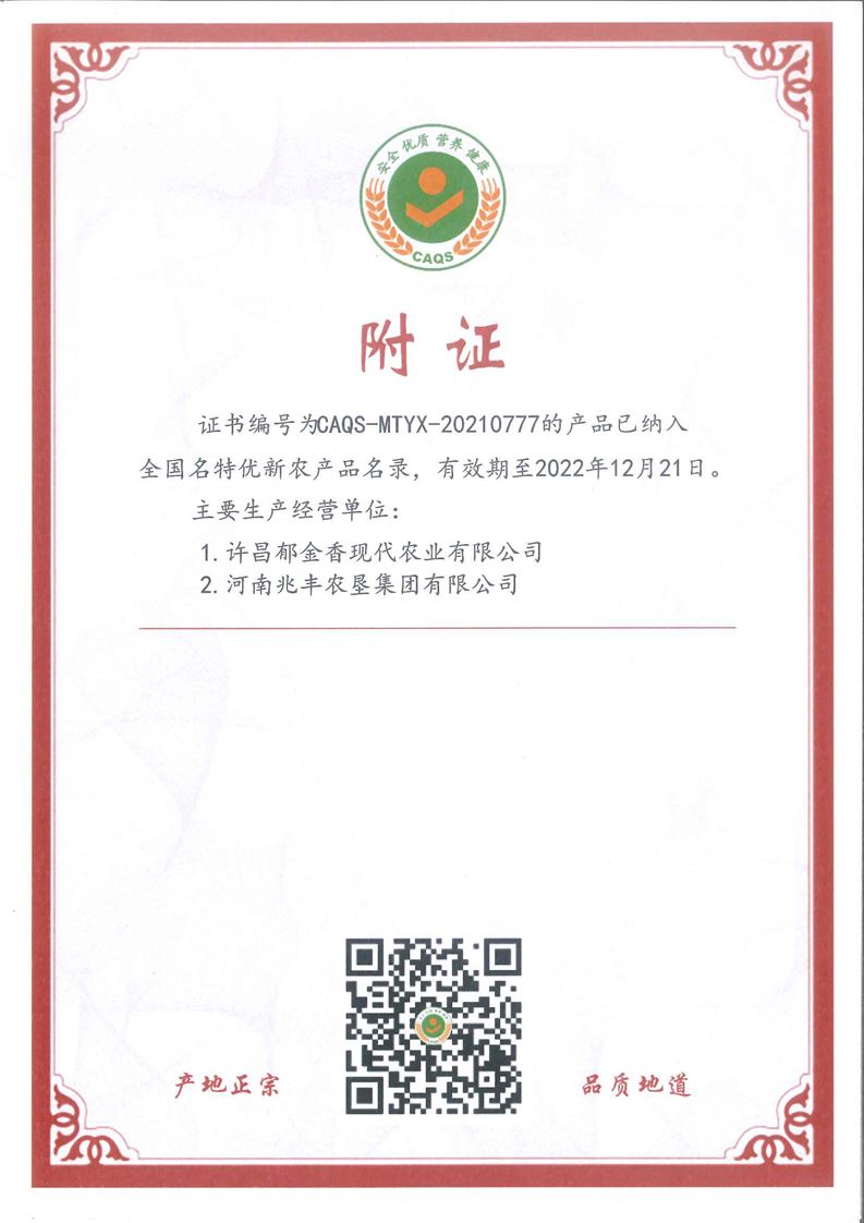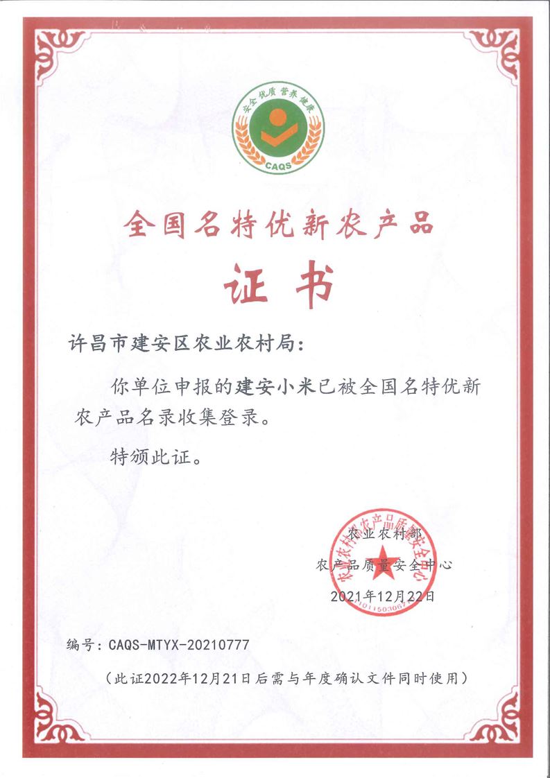 · 祝賀河南兆豐農(nóng)墾集團(tuán)有限公司 申報(bào)的“建安小米”被全國名特優(yōu)新農(nóng)產(chǎn)品名錄收集登錄