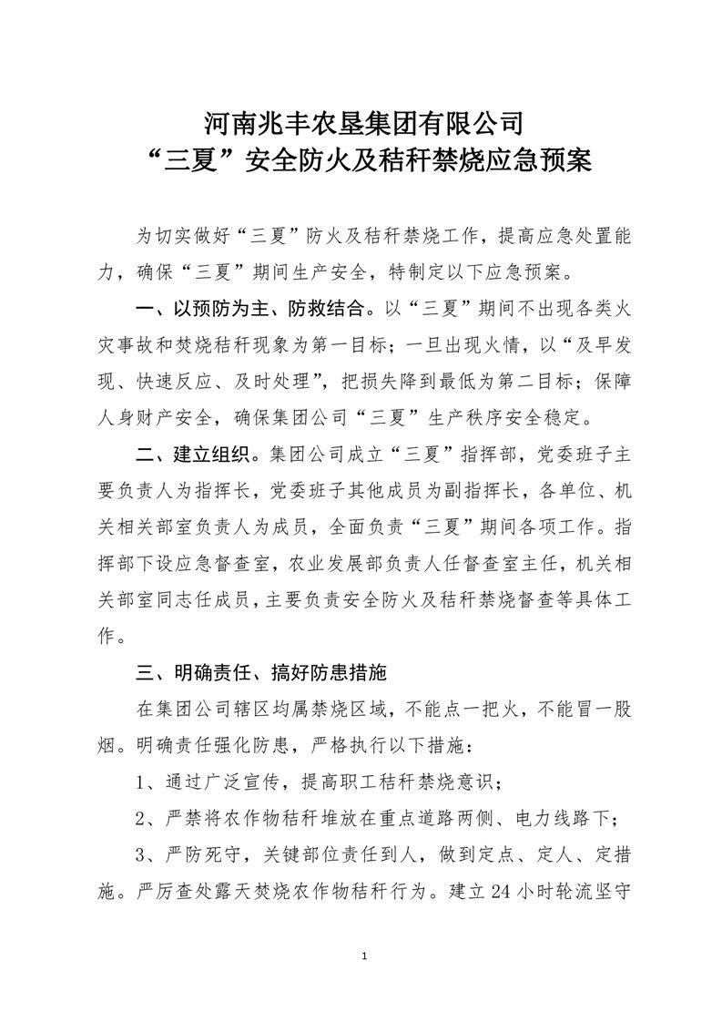 河南兆豐農墾集團有限公司 “三夏”安全防火及秸稈禁燒應急預案